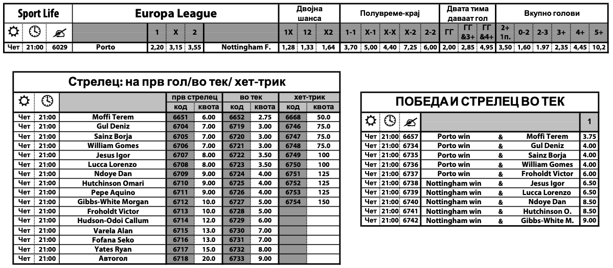 Комплетната Специјална понуда на Sport Life за мечот помеѓу Порто и Нотингем Форест може да ја најдете на следниов ЛИНК.
