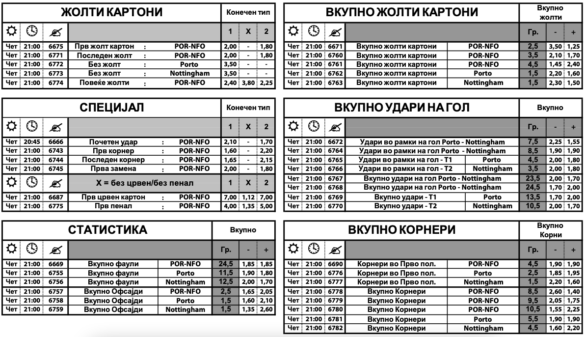 Порто е во мала предност со квота од 2.20, додека триумфот на Нотингем има квота од 3.55, но овие квоти може да бидат и далеку поголеми доколку ги искомбинирате со стрелец. Тогаш би добиле квота и до 9.00.