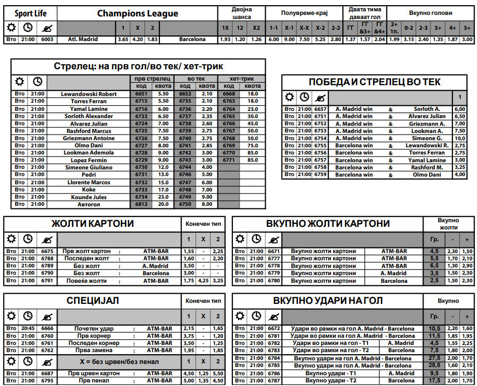 Феран Торес има дадено три гола на последните четири гостувања кај Атлетико, двапати погодувал Роберт Левандовски, а еднаш прецизни биле и Ламин Јамал и Маркус Рашфорд, па јасно е дека овие играчи и вечерва треба да бидат главни адути на гостинскиот тим. Барселона да победи, а Јамал да даде гол е со квота од точно 3.00.