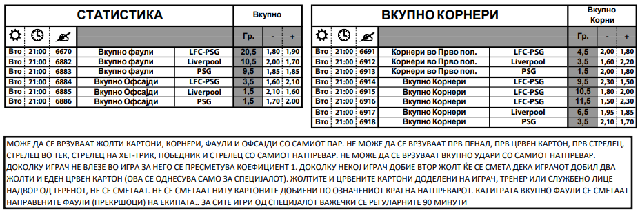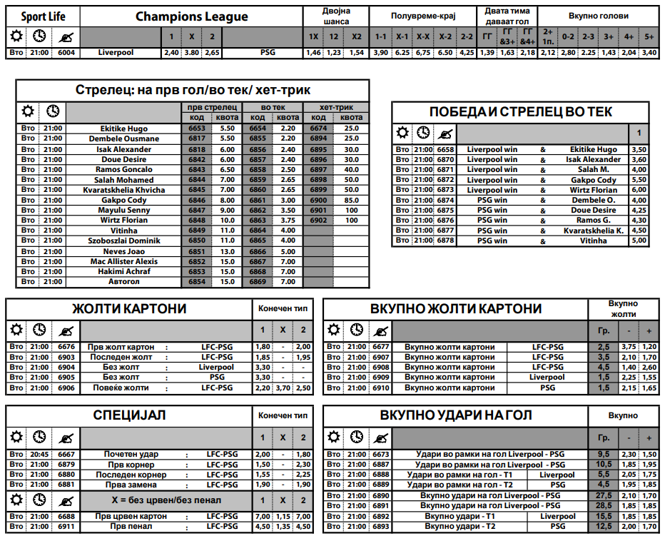 Повеќе од 10-мина фудбалери се во понудата за стрелец на гол, а има и комбинации за стрелец на гол и победник на меч. Ливерпул да слави, а Салах да постигне гол е со квота од точно 4.00. Тука се и статистичките игри за тоа колку шутеви ќе има во рамките на головите, колку фаули ќе бидат направени, колку корнери ќе бидат изведени, потоа тука се и бројот на жолти картони, офсајд-позиции… Едноставно за вакви специјални дуели од Лигата на шампионите има специјална понуда во Sport Life.