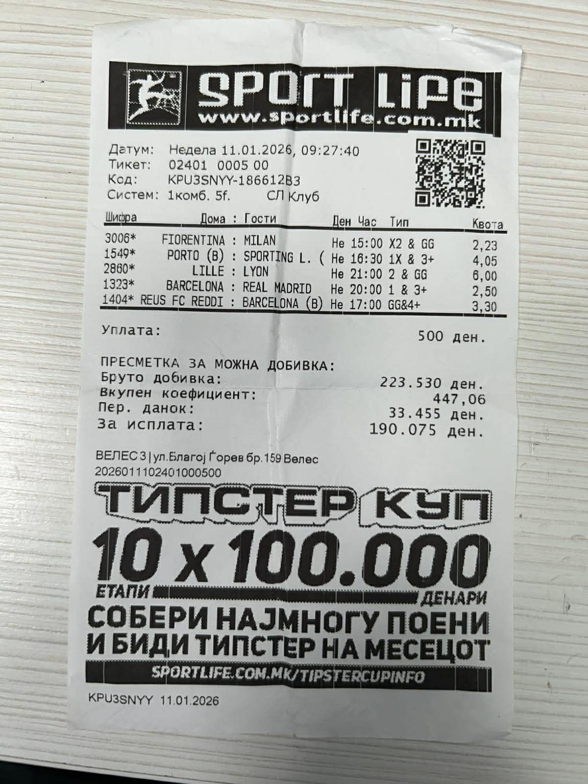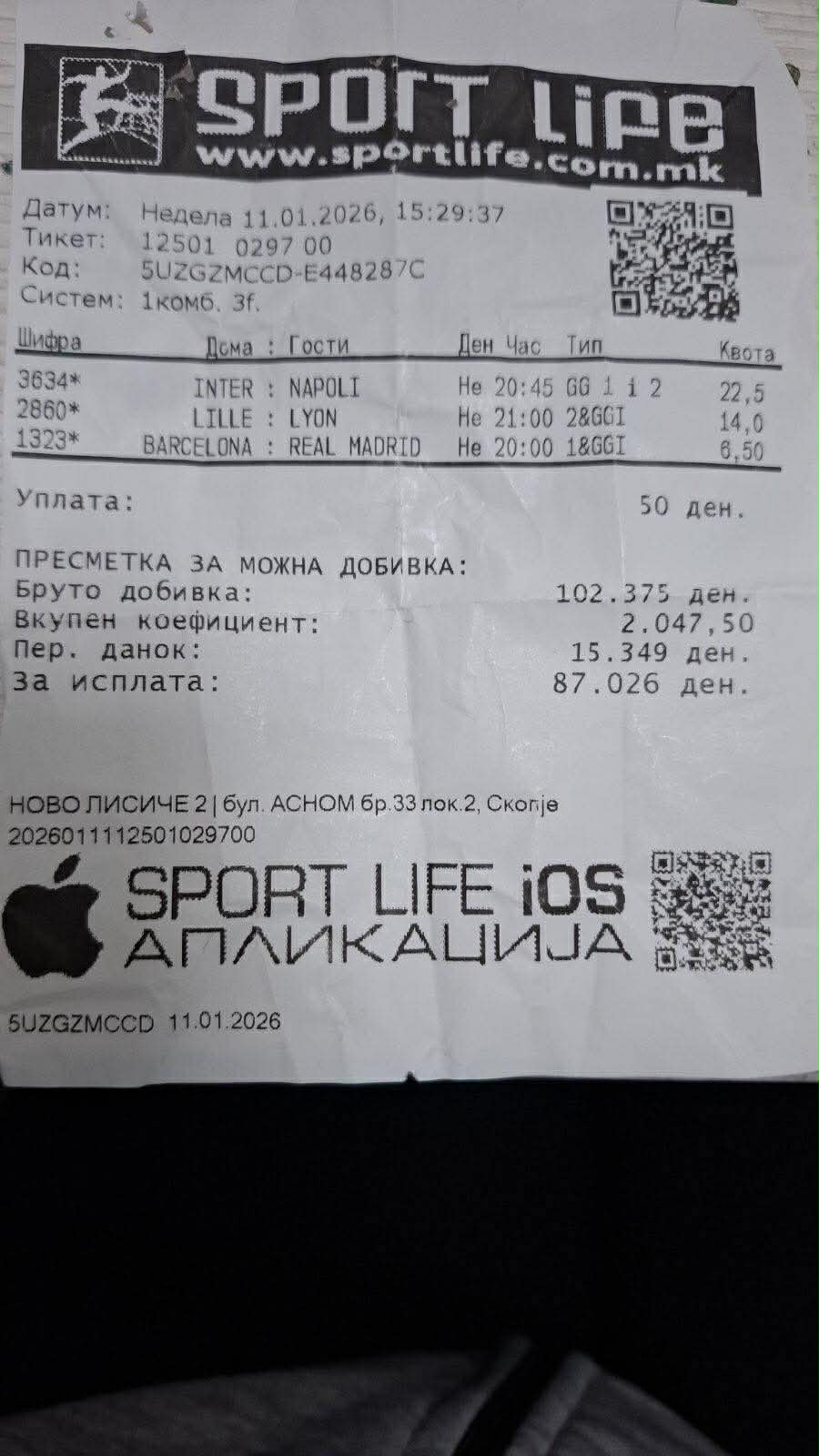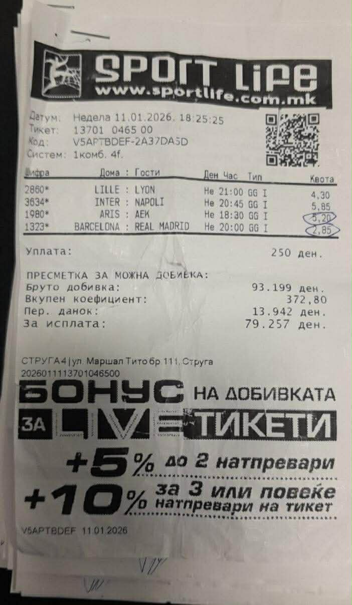 Интересно е дека Барселона водеше со 1:0, а Реал израмни на 1:1 во 45+1 минута и тоа беше момент кој значеше останување во „живот“ на тикетот, а на крајот е и добитен, па со вложени само 50 денари, добивката е 87.026 денари.