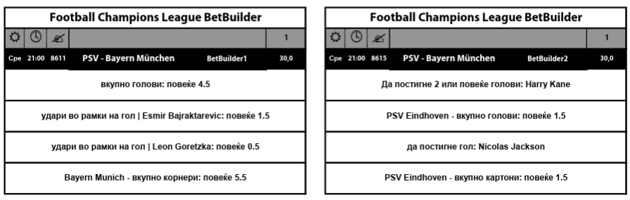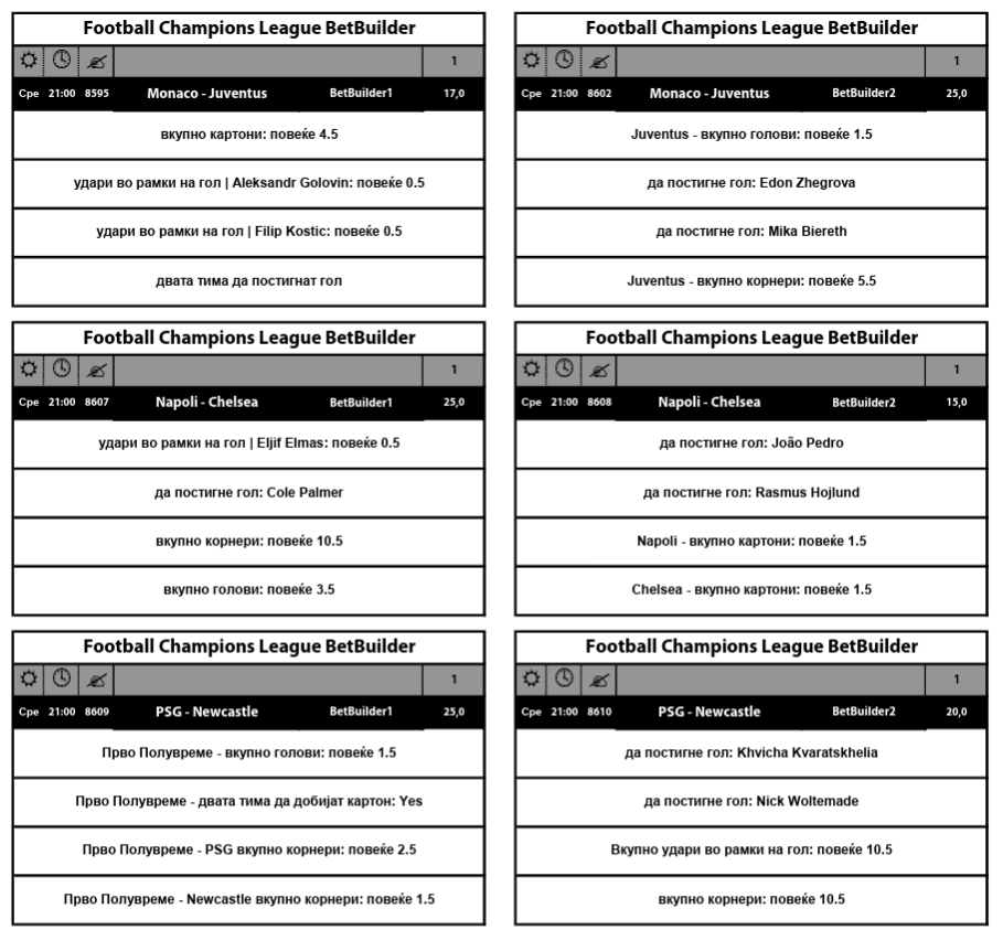 По два Бет билдерa за осум различни натпревари од фудбалската Лига на шампиони ја прават 16-ката супер атрактивна и привлечна за обложување, особено што квотите се огромни, од 13.0 до 30.0.