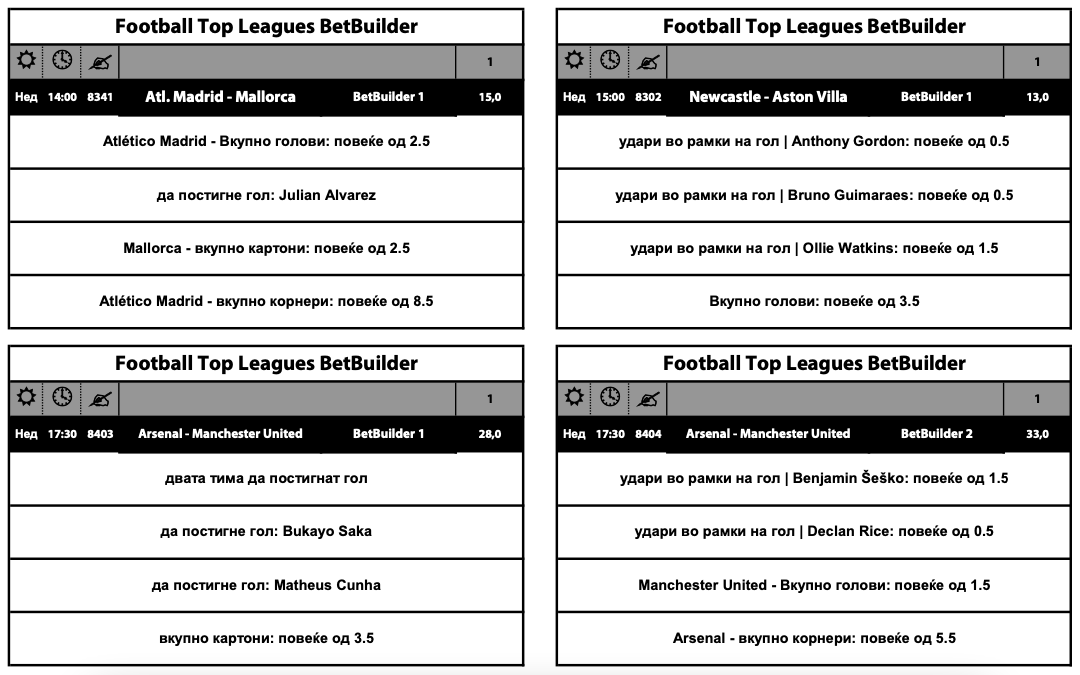 За натпреварите Атлетико Мадрид – Маројка и Њукасл – Астон вила има по една опција со квоти од 15.00, односно 13.00, но затоа за премиерлигашкото дерби помеѓу Арсенал и Манчестер јунајтед има две опции со фантастични квоти од 28.00 и 33.00.