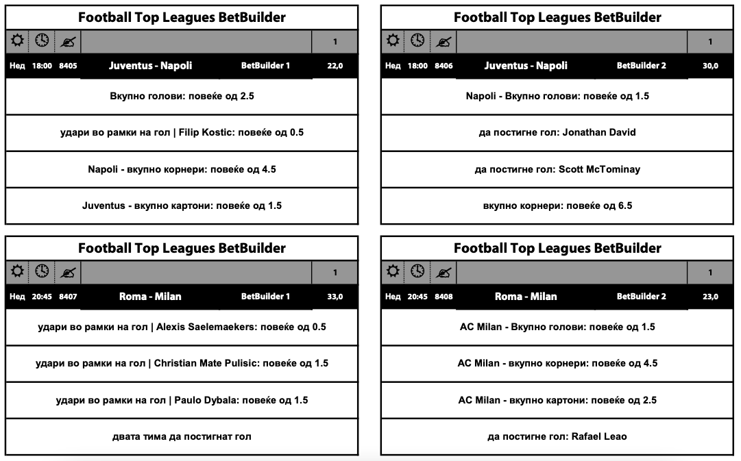 По две опции има и за дерби-дуелите од италијанската Серија А. Јувентус и Наполи имаат квоти од 22.00 и 30.00, додека за мечот на Рома и Милан квотите се 23.00 и 33.00.