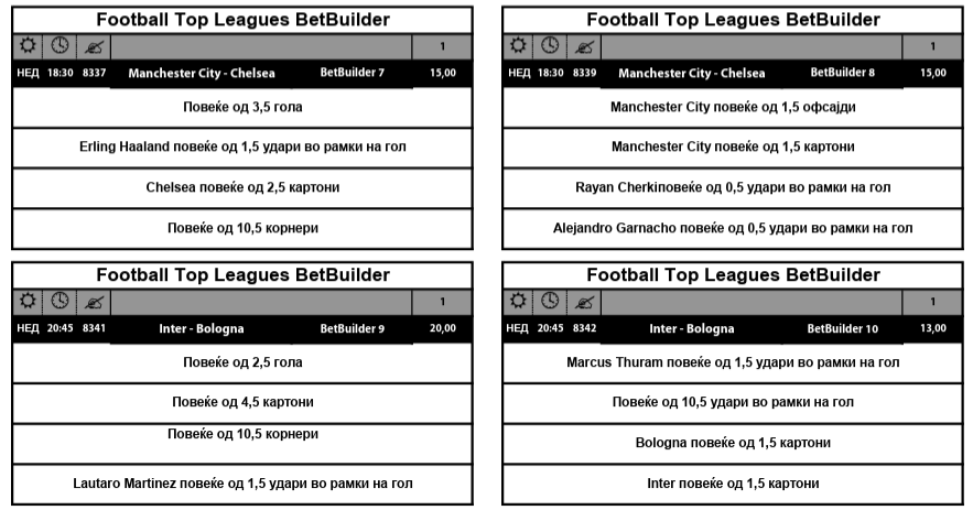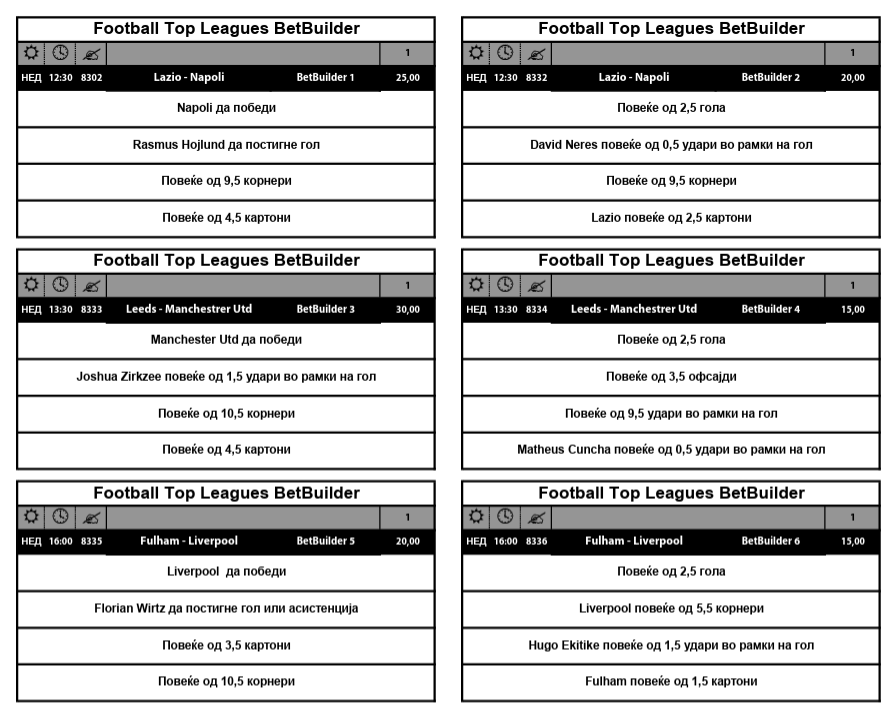Има игри по вкус на тие што веруваат во Наполи, Манчестер јунајтед и Ливерпул, но и опции во кои се бараат по четири услови без да има потреба да се погоди победник, туку се вклучени голови и други статистички елементи како број на картони, корнери и шутеви кон гол.