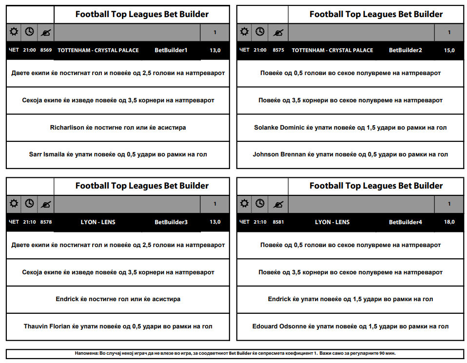 Во Бет билдер понудата има две интересни комбинации кои носат големи квоти. За да биде добитна квотата од 15, потребно е: да има барем еден гол во двете полувремиња, да има повеќе од 3,5 корнери во секое полувреме, Доминик Соланке да упати над 1,5 шута во рамките на голот и Џонсон Бренан да упати над 0,5 удари во рамките на голот.