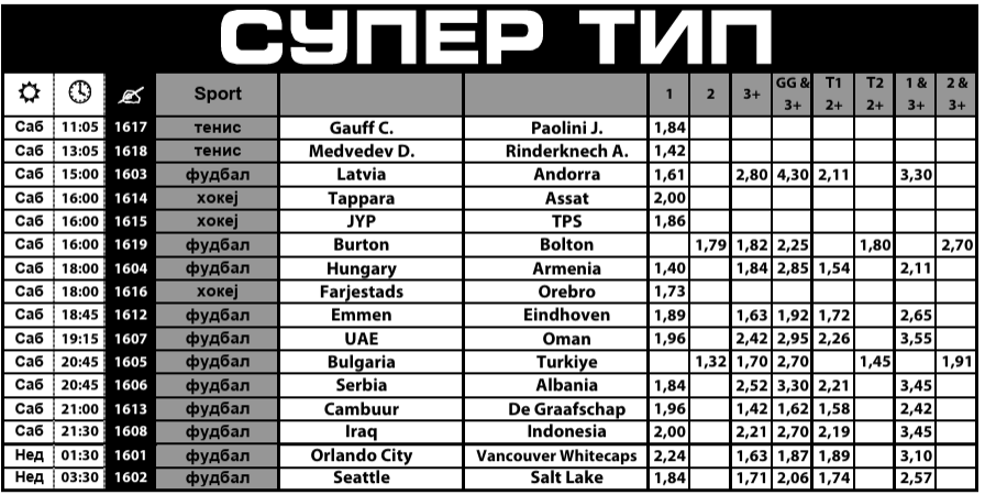 Првиот меч во понудата е Гоф – Паолини кој почнува веќе во 11.05 часот, па ако верувате во триумф на американската тенисерка, треба порано да уплатите. Како и секогаш, за фудбалските мечеви има по пет варијанти, ваше е да одлучите дали ќе одиграте на конечен тип или некоја од комбинациите со вклучени голови.
