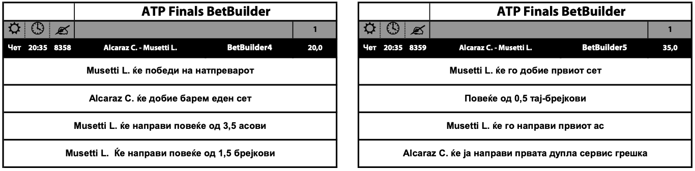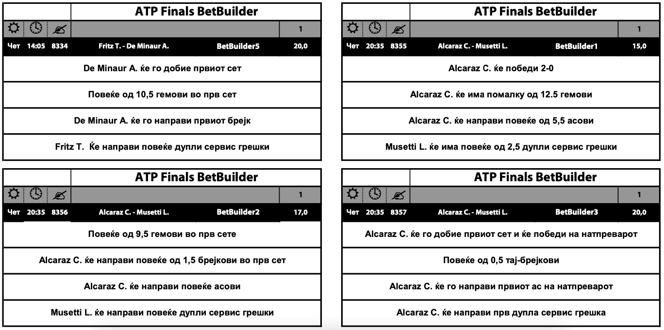 На завршниот АТП-турнир во Торино денес се играат првите два меча од третото коло на групната фаза. Двата меча со по пет опции се дел од понудата со набилдани квоти во Sport Life, Бет билдерот.