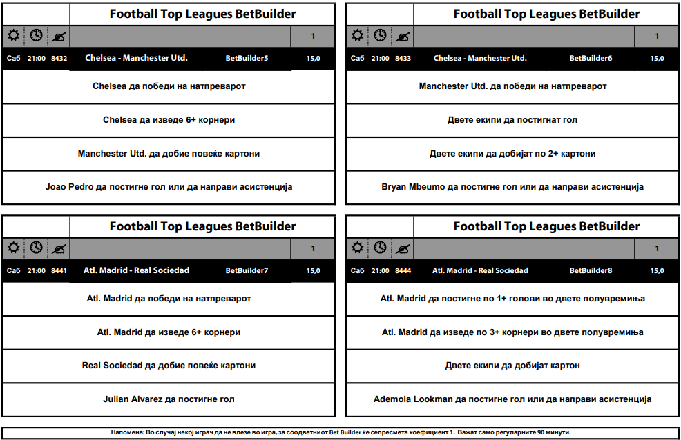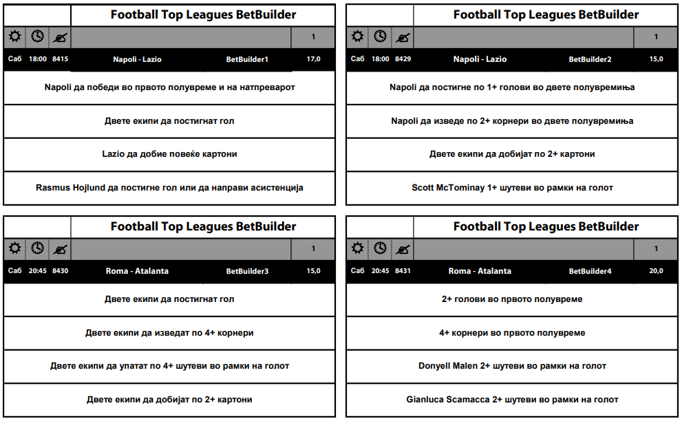 Четири супер интересни натпревари од најфудбалските земји во Европа се дел од Бет Билдер понудата каде коефициентите се движат од 15 до 20. За дуелот меѓу Наполи и Лацио се нуди квота од 17,а да биде добитно потребно е: Наполи да води на полувреме и да победи на крајот, двете екипи да постигнат гол, Лацио да добие повеќе жолти картони и Расмус Хојлунд да постигне гол или да асистира.