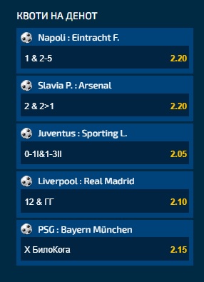 Почнува новото коло во Лигата на шампионите, а најинтересните пет меча се дел од понудата во Квотите на денот. Вкупниот коефициент на петте предлози изнесува 44,79.