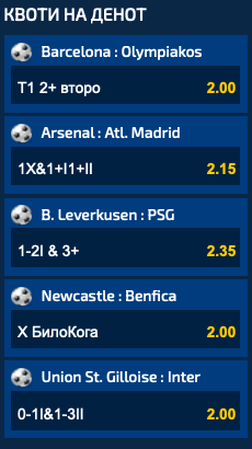 Од фудбалерите на Арсенал се очекува да не загубат на домашен терен од Атлетико Мадрид, а ако тоа се случи, но и ако има најмалку по еден гол и во првото и во второто полувреме, квотата од 2.15 ќе биде добитна.