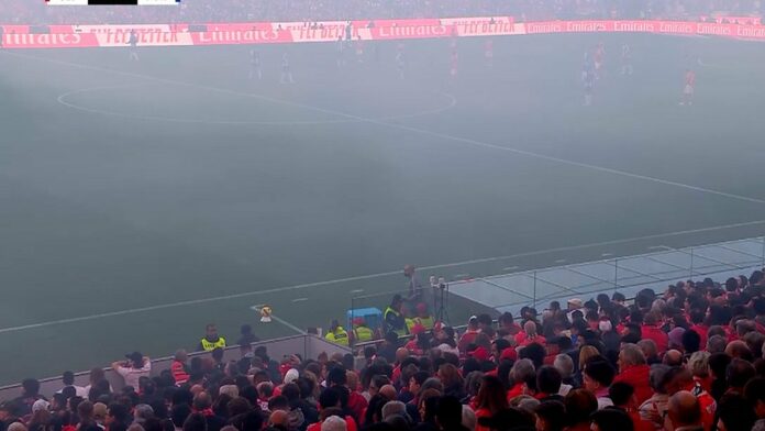 Фудбалерите на двете екипи играат во есктремно тешки услови, бидејќи домашните фанови буквално го запалија стадионот непосредно пред почетокот на мечот.