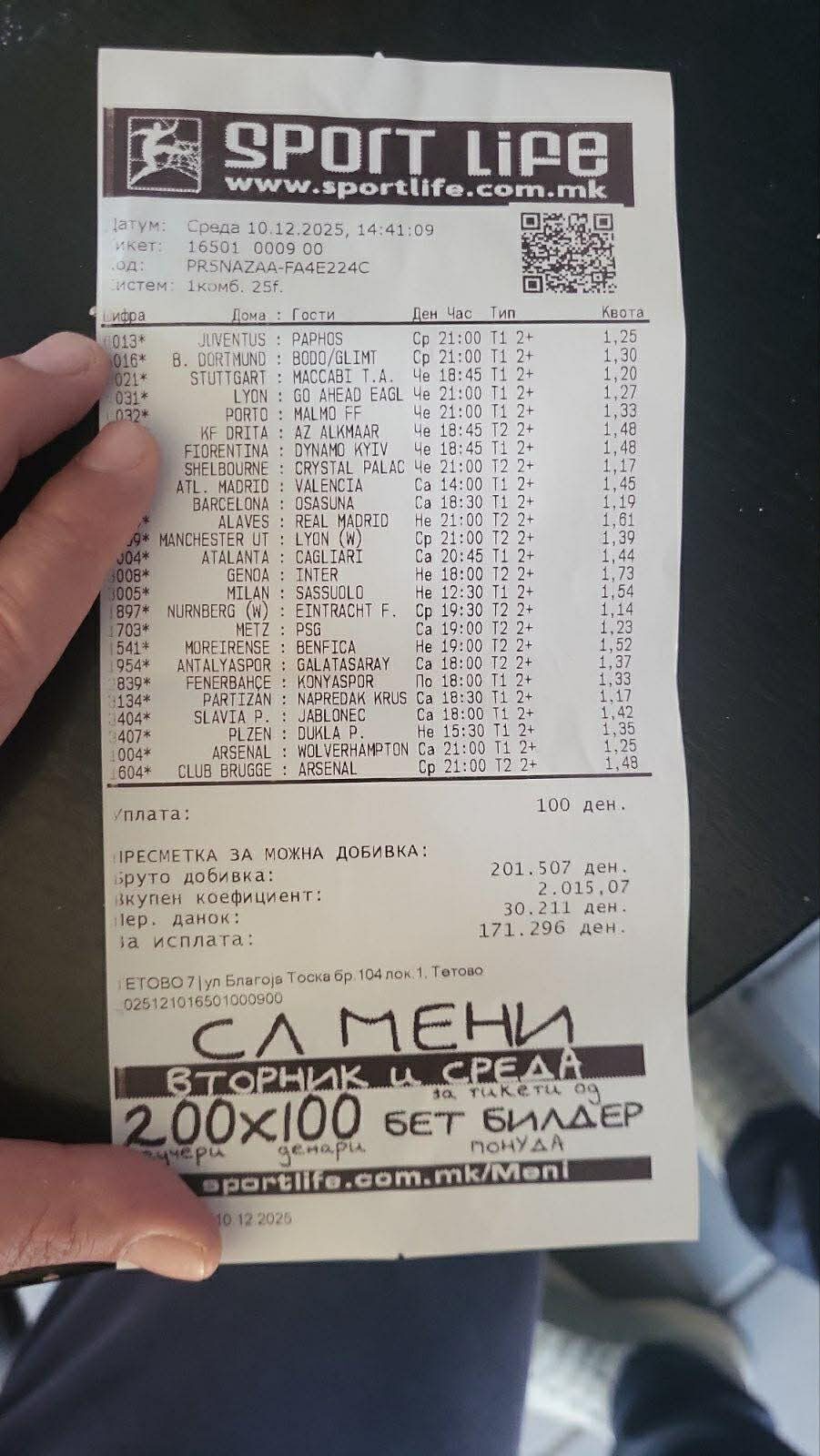 Во еден од објектите на Sport Life во Тетово минатата среда обложувач уплатил 100 денари на тикет дури со 25 пара и во неделата стана јасно дека овој мајсторски одигран тикет ќе биде добитен со погодена вкупна квота од над 2.000.