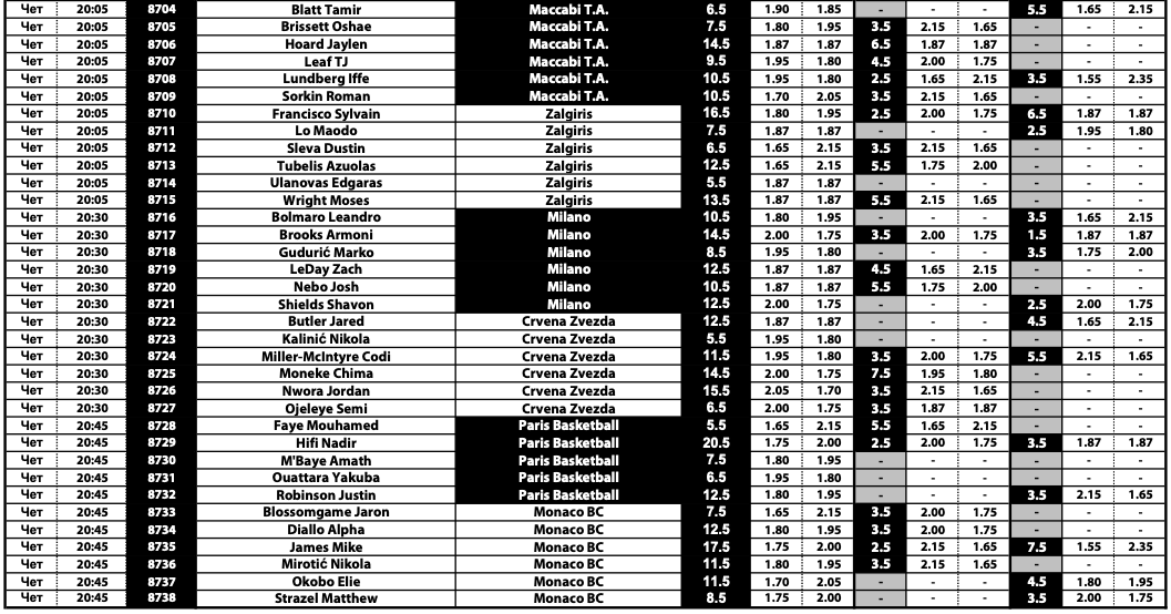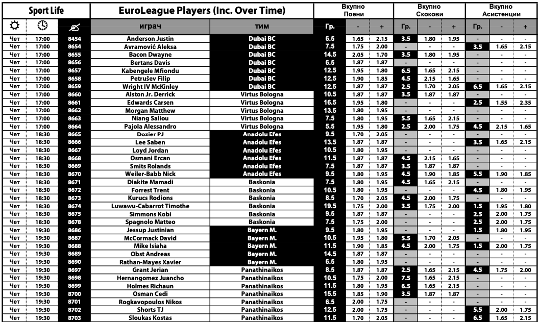 Дел од богатата евролигашка понуда на Sport Life се и кошаркарите со најпопуларната игра меѓу типувачите – „плус-минус“ на поени, скокови и асистенции. Комплетната понуда може да ја најдете на следниов ЛИНК.