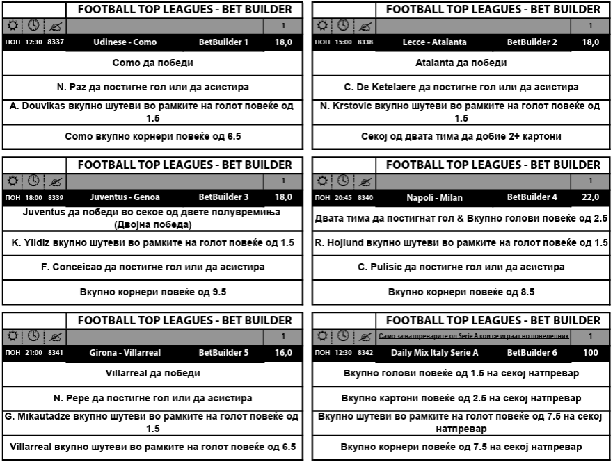 Кај секој од овие мечеви се бара да се исполнат по неколку услови за добивка, а за дневниот микс посветен на дуелите од италијанската Серија А (првиот меч е веќе од 12.30 часот), билдерот е со квота дури од 100.0. Потребно е да има барем по два гола на секој денешен меч, како прв од четирите услови за оваа комбинација да биде добитна.