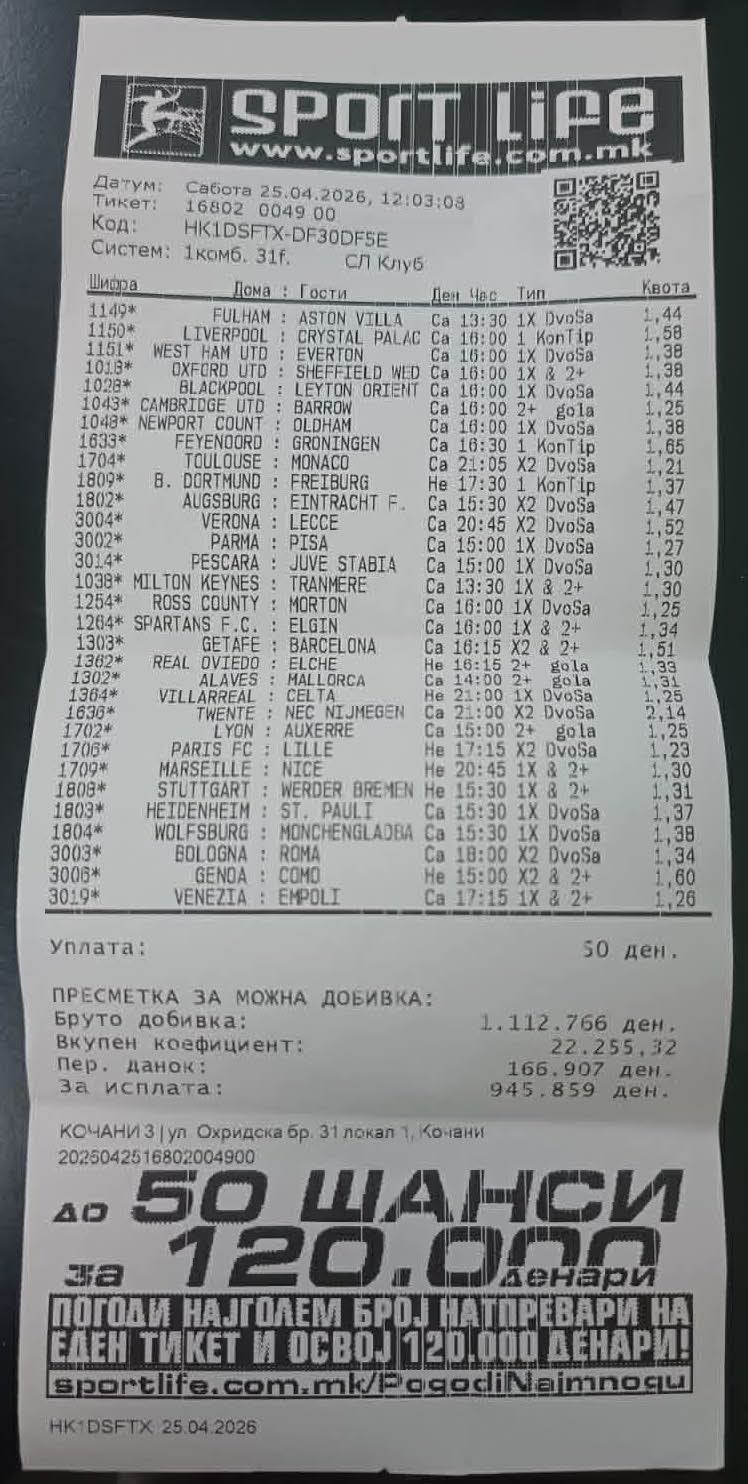Во Sport Life ништо не е невозможно, а доказ за тоа е и тикетот во Кочани. Со влог само од 50 денари, одигра 31 натпревар, кои беа погодени, па сосема заслужено си доби неверојатна сума од 945.859 денари нето.