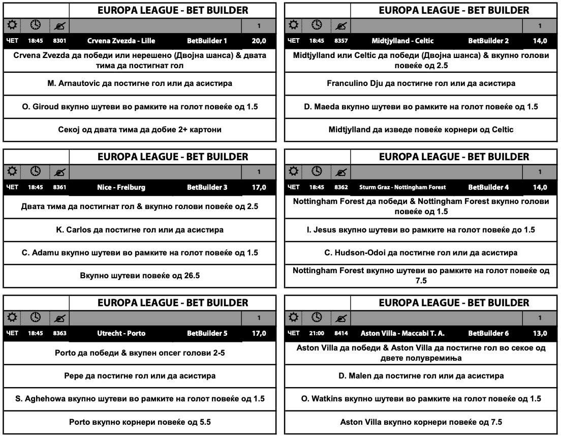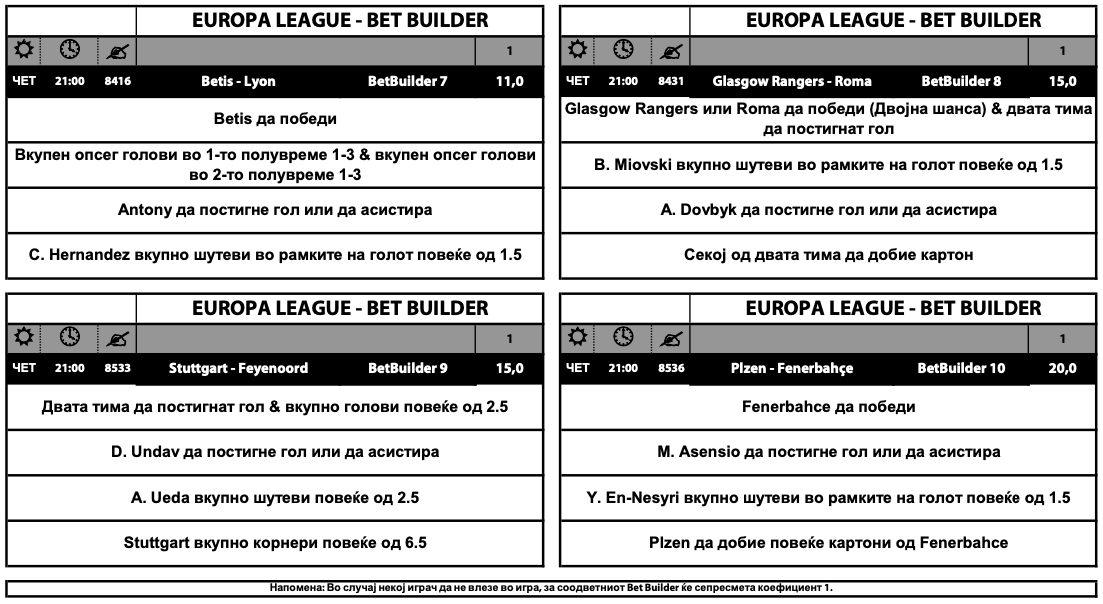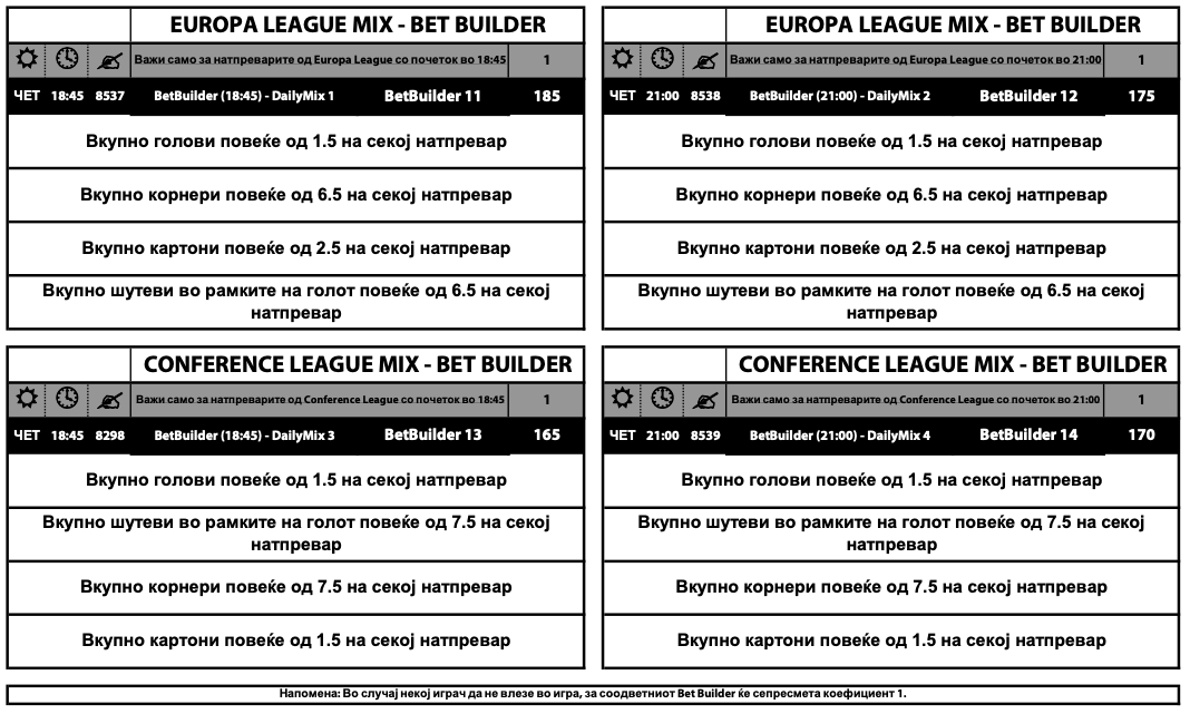 Сепак, убедливо најголемите квоти се за дневниот микс. Во Бет билдерот има четири опции, по две за Лигата на Европа и Конференциската лига.