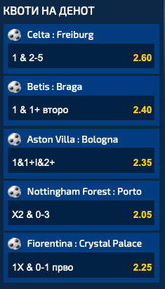 Победа се очекува и од Астон вила против Болоња, а квотата од 2.35 ќе биде добитна ако има барем и еден гол во првото полувреме и најмалку два на целиот натпревар.