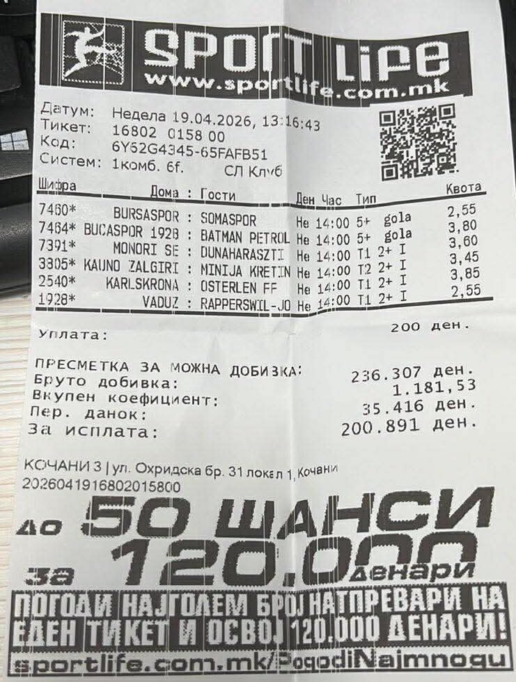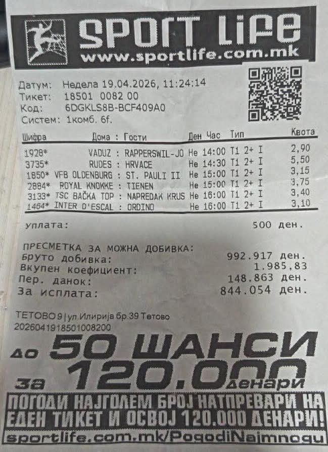 Во Тетово на тикет со шест меча беа вложени 500 денари, а добивката е неверојатна – 844.054 денари нето или малку повеќе од 14.000 евра. Шесте меча беа одиграни на иста игра – домашните екипи да постигнат најмалку по два гола во првото полувреме, а квотите се движеа помеѓу 2.90 и 5.50.