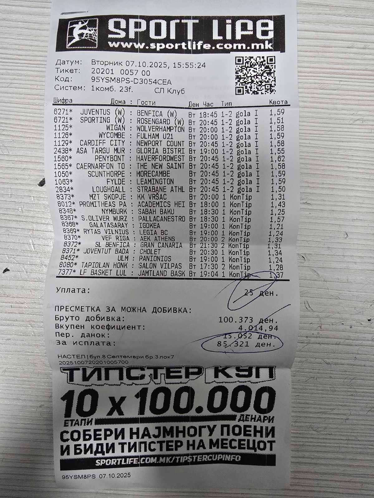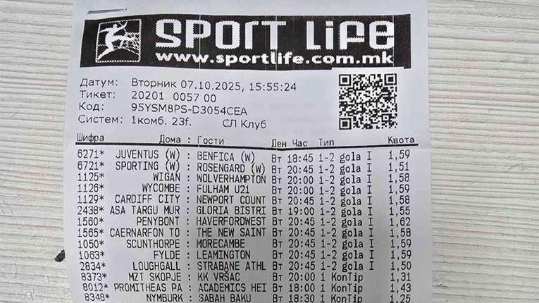 Вчерашниот ден беше супер плоден за еден обложувач кој во објектот на Sport Life во комплексот Настел во скопско Тафталиџе уплатил 25 денари на тикет со дури 23 парови и тикетот е добитен.