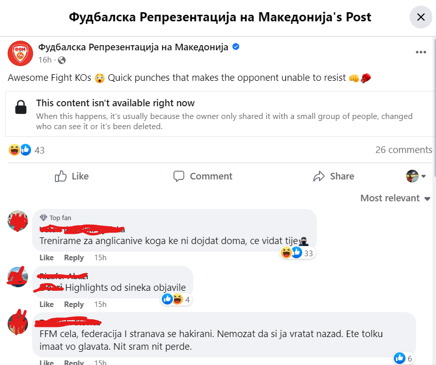Вчера пишувавме дека сме брука и на социјалните мрежи затоа што официјалната фејсбук-страница на Фудбалската репрезентација на Македонија, која има над 130.000 следбеници, повеќе од еден и пол месец е хакирана и може да се видат само некои небитни видеа. Токму неколку часа по дебаклот во Манчестер, на страницата на ФФМ се појави ново небитно видео, додека официјална изјава, реакција, коментар или став од првите луѓе на фудбалот нема.
