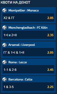 Денешните пет меча во Квоти на ден носат вкупен коефициент од 54.44, ако заедно се одиграат на еден тикет. монако гостува кај Монпелје и се очекува гостите да не загубат во меч на кој ќе погодат двете екипи. За Х2&ГГ коефициентот е 2.05.
