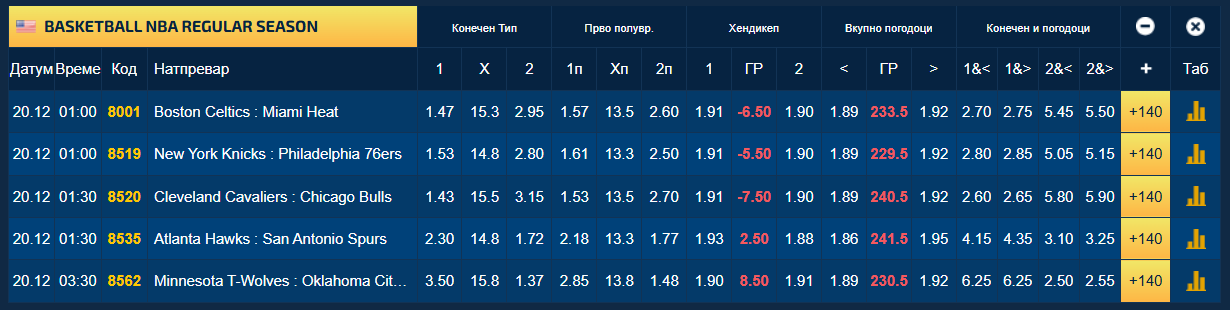 Пет меча се играат вечерва во НБА-лигата, а интересно е дека, според квотите, на четири има изразити фаворити. Бостон е домаќин на Мајами во меч на две екипи кои имаат по 15 победи сезонава. Мајами беше во лоша серија од пет порази, која беше прекината со победа над Бруклин, но, сепак, на Жешките ќе им биде многу потешко да го изненадат Бостон.
