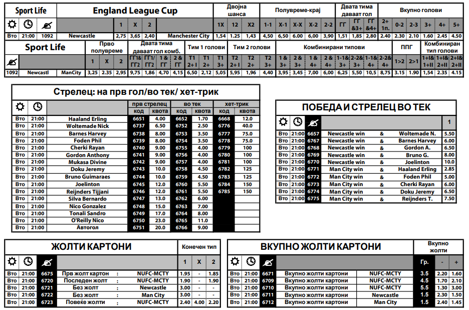 Сезонава Њукасл на свој терен веќе еднаш го победи Сити, и тоа со 2:1 во првенството, а сите три погодоци беа постигнати во второто полувреме. Сега, главен фаворит за прв стрелец на гол вечера е Ерлинг Халанд, а тука се и Ник Волтмејд, Фил Фоден, како и Харви Барнс, кој го постигна првиот гол на нивната последна пресметка.