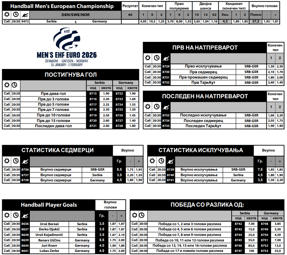 Германија има шест победи во последните шест средби со Србија. Сепак, Србите предводени од селекторот Раул Гонзалес против Шпанија покажаа дека може да бидат опасен ривал. Ако започнат екстра мотивирани, Србите може да стигнат и први да постигнат пет гола, комбинација која е интересна во специјалите кои се нуди.
