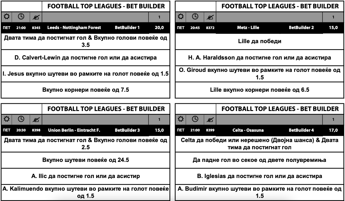 Најголемите квоти во Македонија, како и секогаш, се во Бет билдерот на Sport Life, кој за петок нуди четири меча со по една опција и квоти кои достигнуваат и до 20.00.