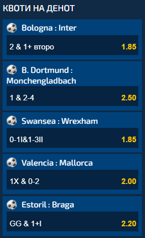 Најголемата квота во Квотите на денот, 2.50, е за мечот помеѓу двете екипи со име Борусија, од Дортмунд и од Менхенгладбах. Квотата ќе биде добитна само ако домашните победат во меч на кој ќе бидат постигнати помеѓу два и четири гола.