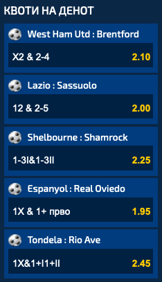 Најголемата квота од Квотите на денот е за мечот помеѓу Тондела и Рио Аве, 2.45, а ќе биде добитна само ако домашните не загубат, но и ако има најмалку по еден гол во двете полувремиња.