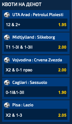 Црвена ѕвезда гостува кај Војводина, а понудената квота од 2.00 ќе биде добитна само ако „црвено-белите“ не загубат во Нови Сад, но и ако во првото полувреме не биде постигнат повеќе од еден гол.