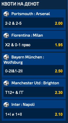 Премиерлигашкиот лидер, Арсенал, гостува кај второлигашот Портсмут, а квотата од 2.00 ќе биде добитна само ако „топчиите“ имаат водство на полувремето и на крајот победат, но и ако на мечот бидат постигнати помеѓу два и пет гола.