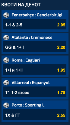Фенербахче е голем фаворит против Генчлербирлиги, па квотата од 2.05 ќе биде добитна ако домашните имаат водство на полувремето и на крајот победат, но и ако има помеѓу два и пет гола на целиот натпревар.