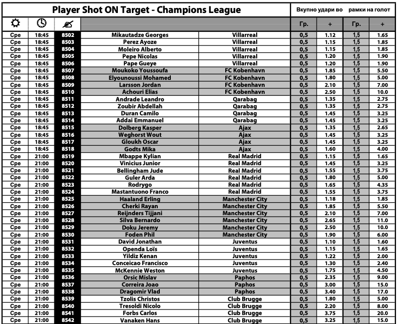 Меѓу најголемите фаворити се Ерлинг Халанд и Килијан Мбапе и нивниот меѓусебен дуел на „Сантијаго Бернабеу“. Норвежанецот да упати барем два удари кон голот на Реал има квота од 1.85, додека квотата за Килијан Мбапе за таа игра е 1.65.