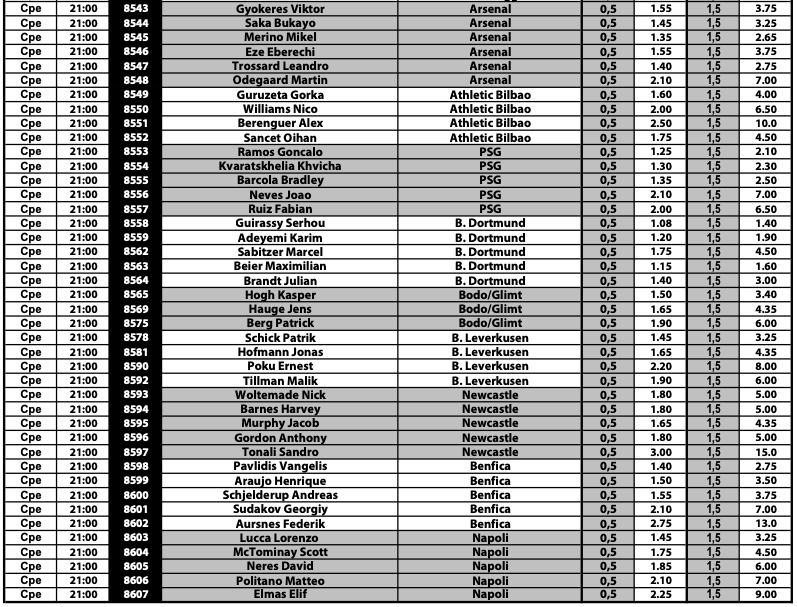 Дел од понудата во која има стотина фудбалери е и нашиот Елиф Елмас, кој со Наполи гостува кај Бенфика. Квотата за еден удар во рамките на противничкиот гол на македонскиот репрезентативец е 2.25, додека за два удари квотата е фантастична – 9.00.