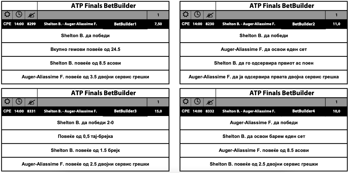 За двата меча има по пет опции, односно вкупно 10. Шелтон и Оже-Алијасим играат во 14 часот, а квотите за петте опции се движат помеѓу 7.00 и 15.00.