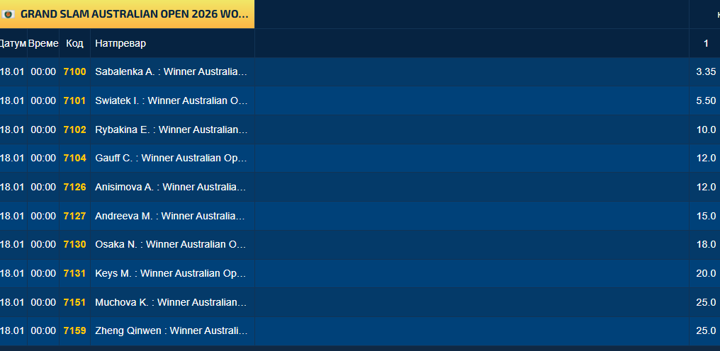Лани турнирот го освои Синер, а Алкарас испадна од Ѓоковиќ во четвртфиналето. Потоа Новак поради повреда го предаде полуфиналето со Александер Зверев. Ова е можеби последна шанса за Ѓоковиќ да триумфира во Мелбурн и квотата од 12.0 делува мошне примамливо за тие што веруваат во него.