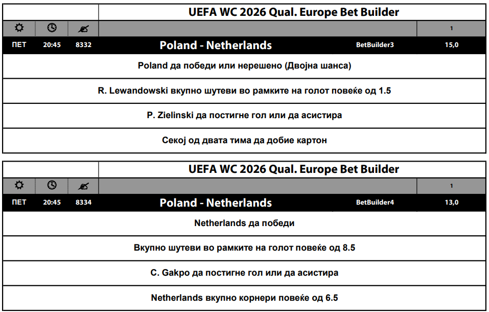 Во понудата е и дербито меѓу Полска и Холандија, и тоа со две билдерски комбинации. Коефициент 13 ќе биде добитен ако: Холандија победи, има повеќе од 8,5 вкупно шутеви во рамките на головите, Гакпо даде гол или асистира и Холандија изведе повеќе од 8,5 корнери.