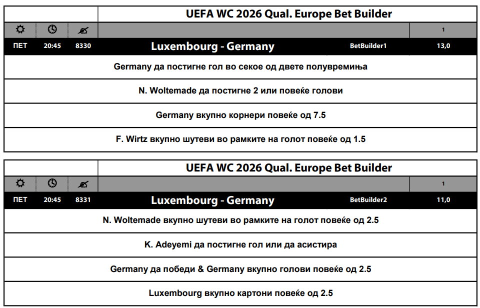 Германија е апсолутен фаворит за победа на гости кај Луксембург, а дури 13 коефицинет се дава ако се исполнат следните комбинации: Германија да даде гол во двете полувремиња, Ник Волтемејд да постигне два или повеќе голови, Германија да изведе повеќе од 7,5 корнери и Вирц да има повеќе од 1,5 шутеви во рамките на голот.