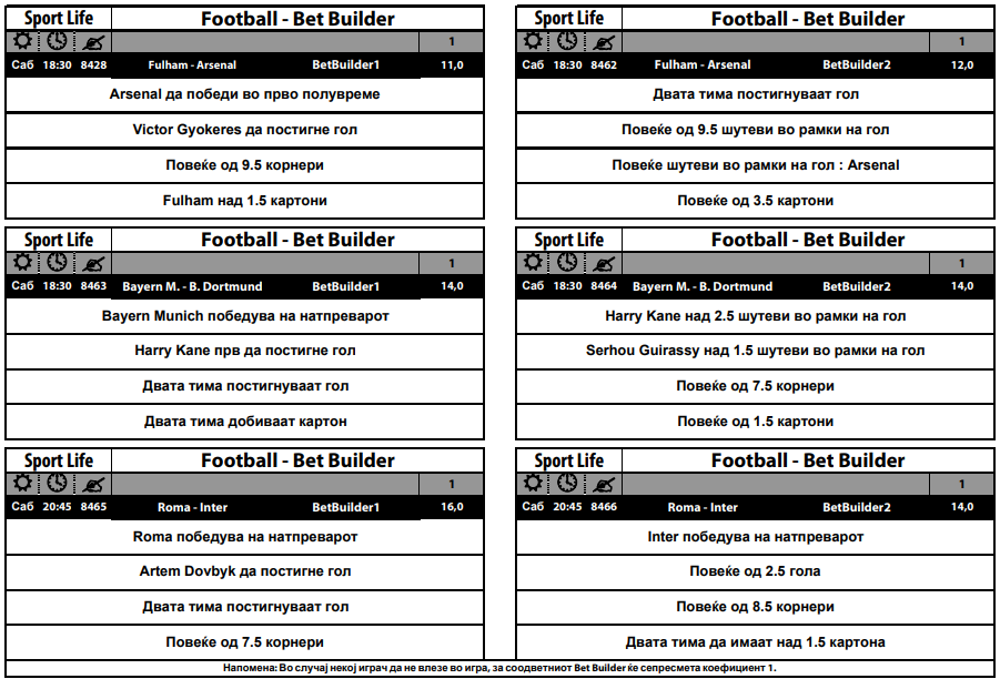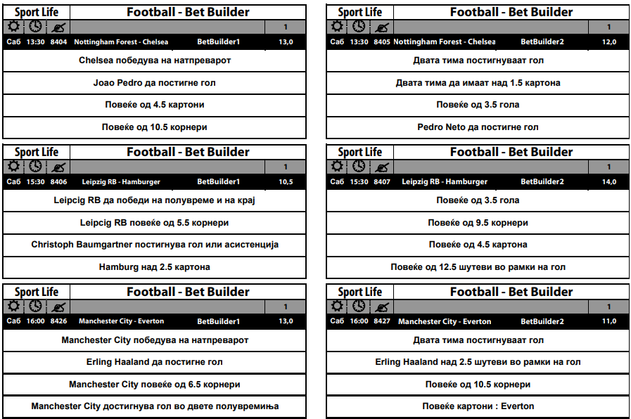 Возбудувањата ќе започнат уште во 13:30 часот со дуелот Нотингем форест – Челзи, каде една од двете опции носи коефициент од 13. Тој ќе биде добитен ако: Челзи победи, Жоао Педро даде гол, има над 4,5 картони и има над 10,5 корнери.