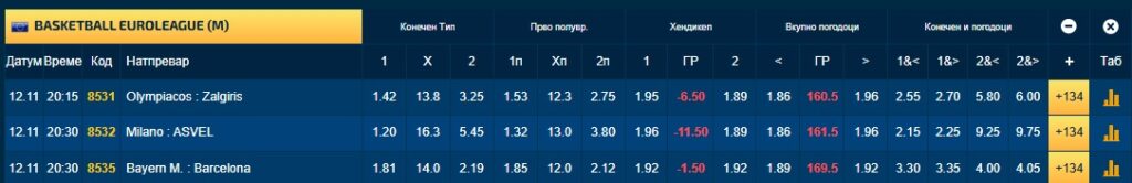 Евролигата вечерва нуди три нови натпревари, а во два од нив домаќините се големи фаворити. Олимпијакос го пречекува Жалгирис, а Армани Милано ќе биде домаќин на Асвел. Тука, според квотите, се очекуваат победи на домашните екипи.