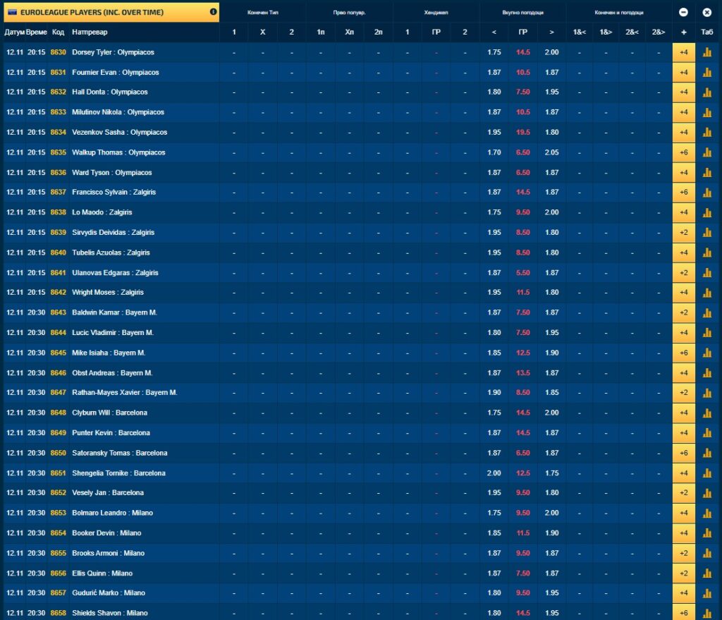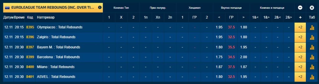 Покрај стандардните квоти, можете да одиграте и на тимскиот ефект на секоја екипа, на постигнати поени, скокови, асистенции, фаули.