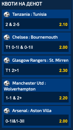 Во најинтересниот меч од Премиер лигата вечерва играат Арсенал и Астон вила. Понудената квота од 2.00 ќе биде добитна само ако во првото полувреме не биде постигнат повеќе од еден гол, додека во второто полувреме потребни се помеѓу еден и три гола.