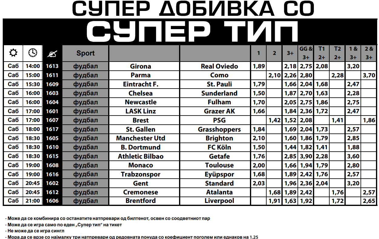 Фудбал и само фудбал нуди денешната понуда на Супер тип, што е и логично ако се знае колкава е понудата на најпопуларната игра во светот. Возбудувањата ќе започнат од 13 часот кога се игра дуелот од втората германска лига меѓу Херта Берлин и Динамо Дрезден. За триумф на Херта, квотата е 2.02.