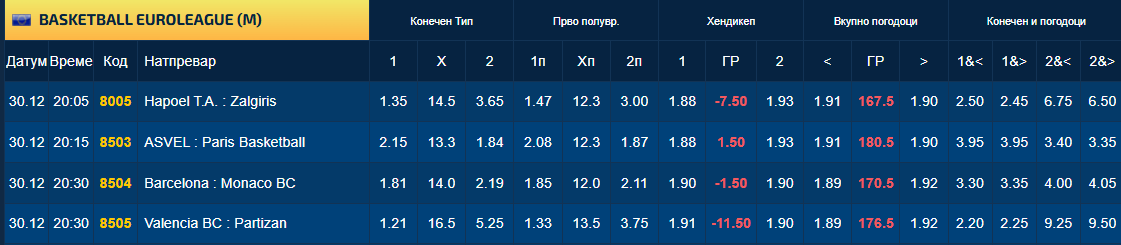 Победа на Валенсија над Партизан е најчистиот фикс на вечерашните мечеви во Евролигата, барем според квотите во Sport Life.