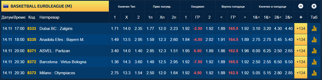 Како фаворити на свој терен се издвојуваат Анадолу Ефес во дуелот против Баерн Минхен и Барселона во пресметката против Виртус Болоња.