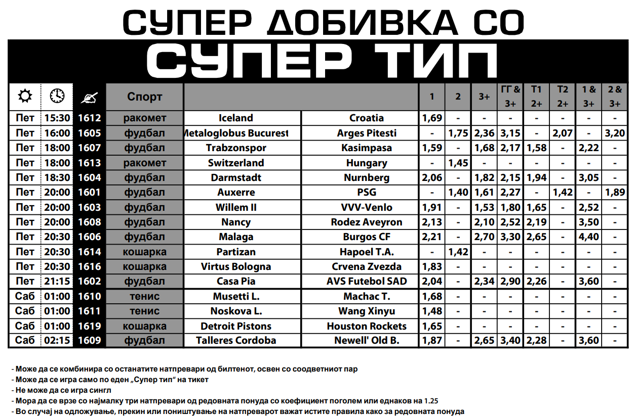 Од фудбалот, победите на ПСЖ и Интер треба да се „сигурици“, а зголемени квоти има и за победи на Дармштат, Трабзонспор, Вилем Втори…