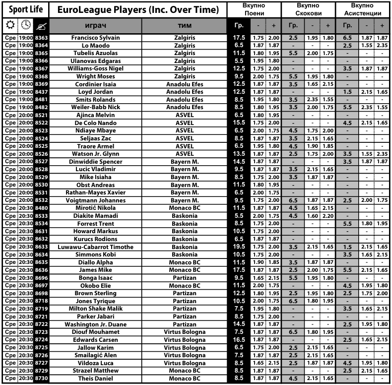 Дел од богатата евролигашка понуда во Sport Life се и кошаркарите со најпопуларната игра меѓу играчите – „плус-минус“ поени, скокови и асистенции. Комплетната понуда може да ја најдете ТУКА.
